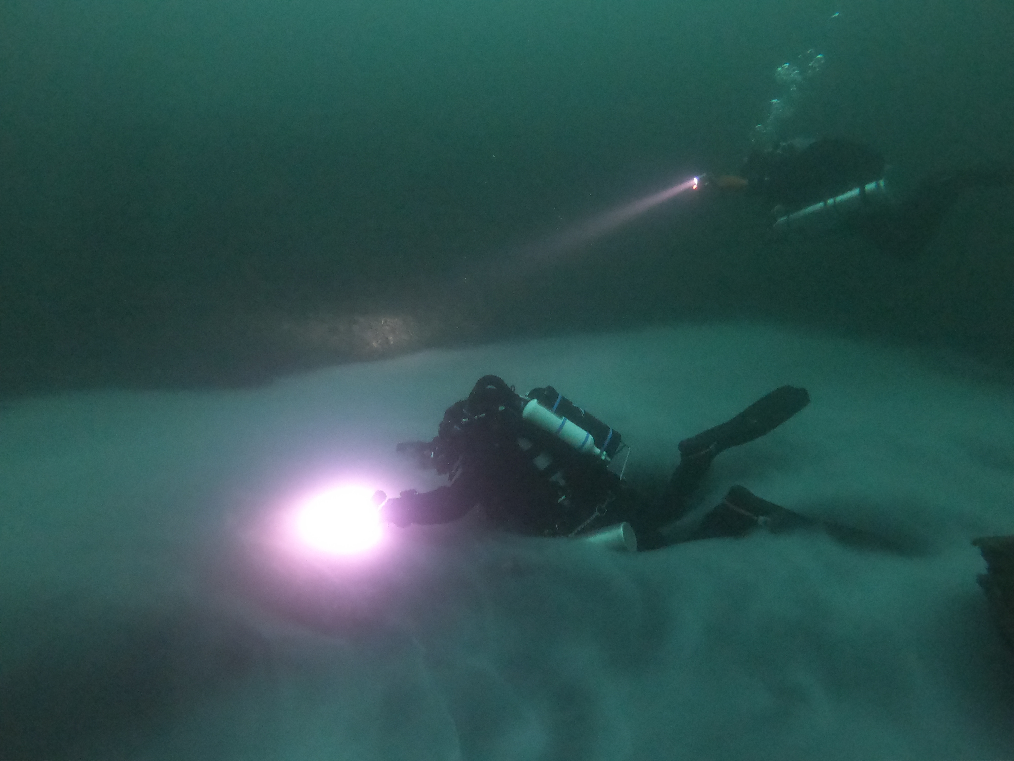 bývá zvláštním úkazem, ke kterému dochází pod vodou za podmínek, že je voda v klidu. Ve starém dole, hluboko na dně, jsme při jednom z průzkumných ponorů narazili na sírnou pokličku, která se vytvořila v nejhlubším místě dolu. Sirovodík, který byl běžně rozptýlen po celém podvodním horizontu se nyní, vlivem zvláštních fyzikálních podmínek, soustředil na jednom místě. Nádherný pohled na mraky střídala otázka, kde je dno, co je pod poklicí? Tato výzva nás vylákala k proplutí oné záhadné vrstvy. Bylo to jako propadat mezi mraky. Zápach sirovodíku pronikal do otevřených okruhů a také do rebrítrů. Po několika metrech jsme narazili na dno, kde byla vrstva čisté vody, která se ale díky našemu pohybu začala mísit s bílými mraky. No, pohled to byl nádherný.